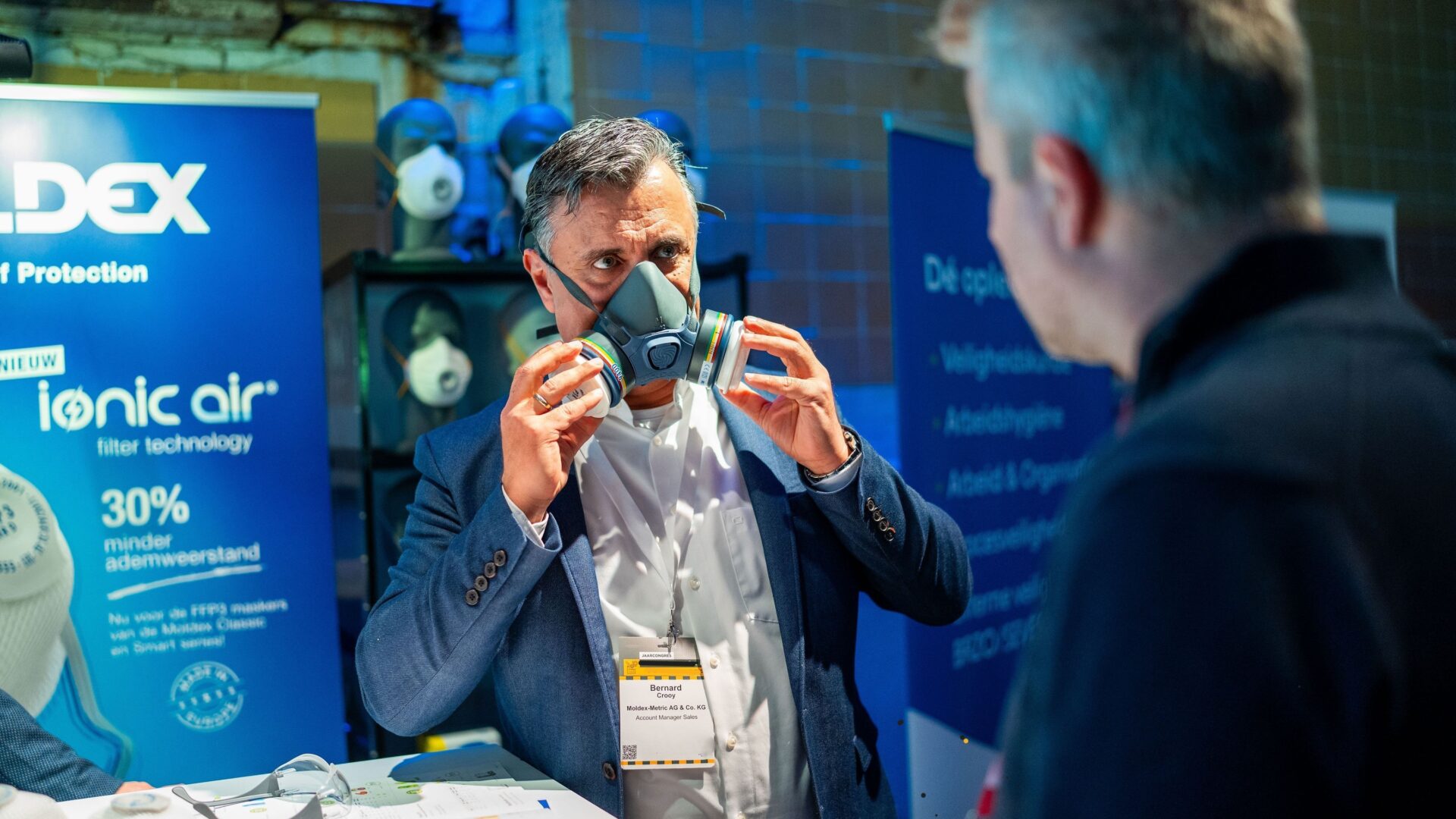 Foto: productspecialist Bernard Crooy demonstreert een halfgelaatsmasker