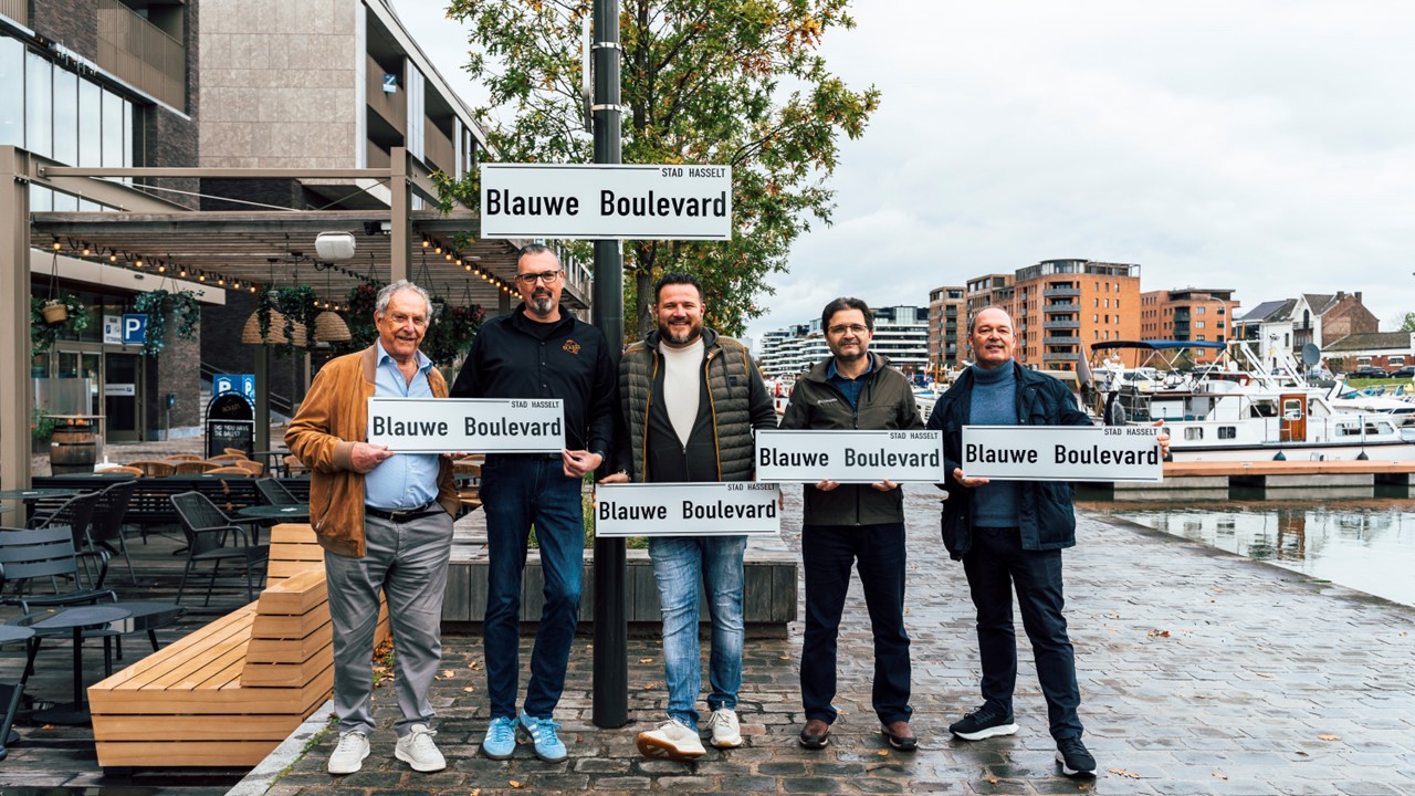 Donderdag 17 oktober 20204 gingen horecaondernemers aan de zogenaamde Blauwe Boulevard in Hasselt de straat op met een groot nieuw straatnaambord om hun identiteit ook feitelijk op de locatie te bevestigen.