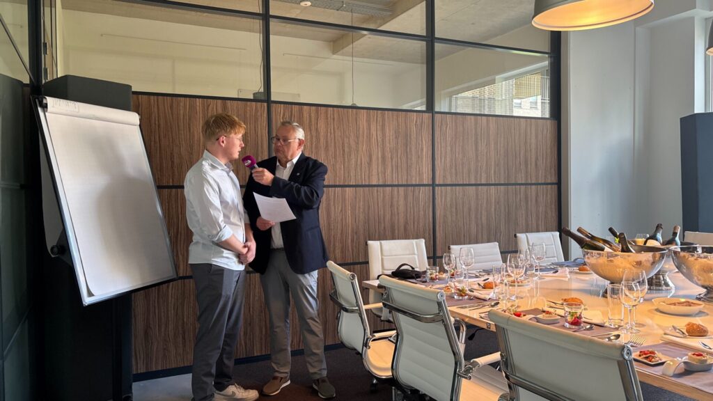 Werner Couck en Stan Janssen praten nog na over de 1ste perslunch in Maasmechelen.