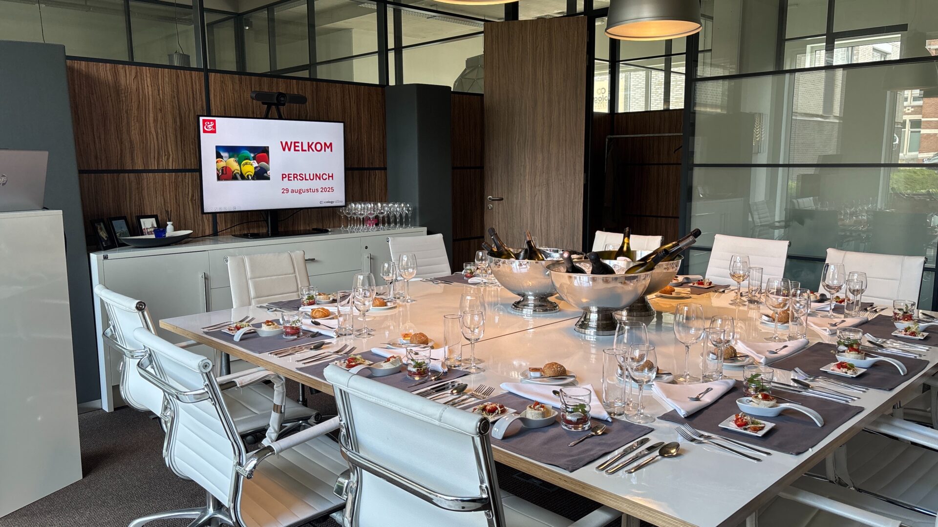 Werner Couck en Stan Janssen praten nog na over de 1ste perslunch in Maasmechelen.